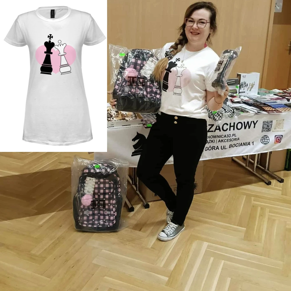 Biała damska koszulka szachowa z grafiką figur szachowych