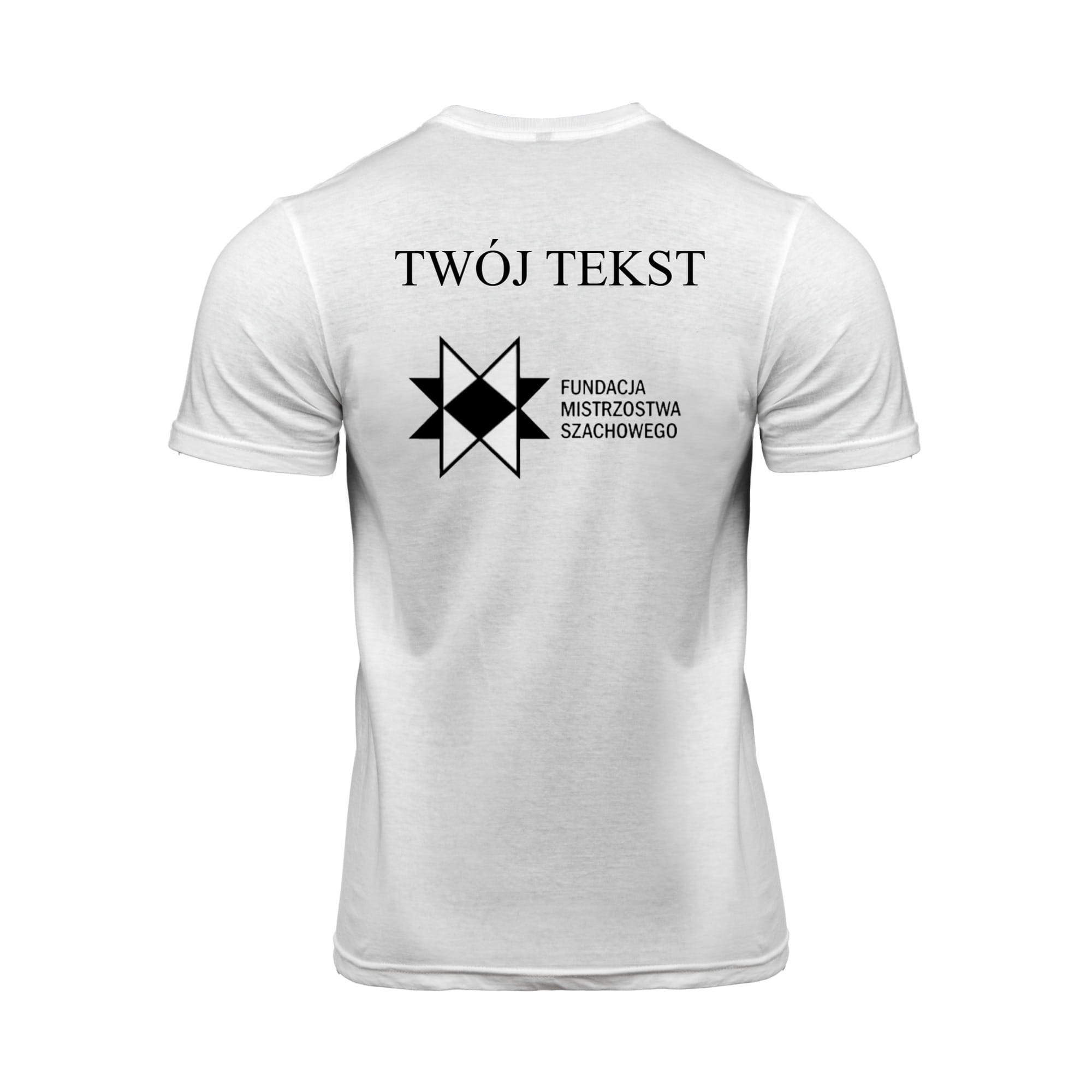 T-shirt męski 100% bawełna 180g/m2 z przodu logo Zielonej Góry oraz Akademii Szachowej Zielona Góra, z tyłu logo Fundacji Mistrzostwa Szachowego oraz Twój dowolny napis