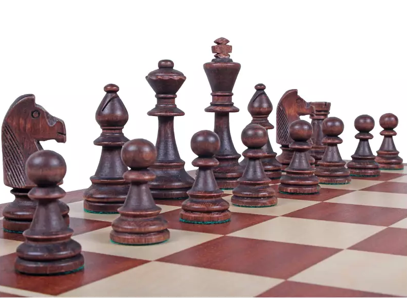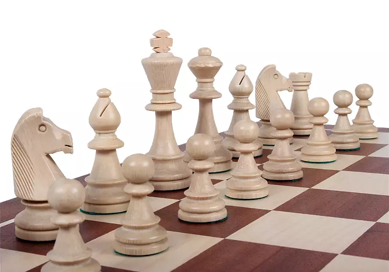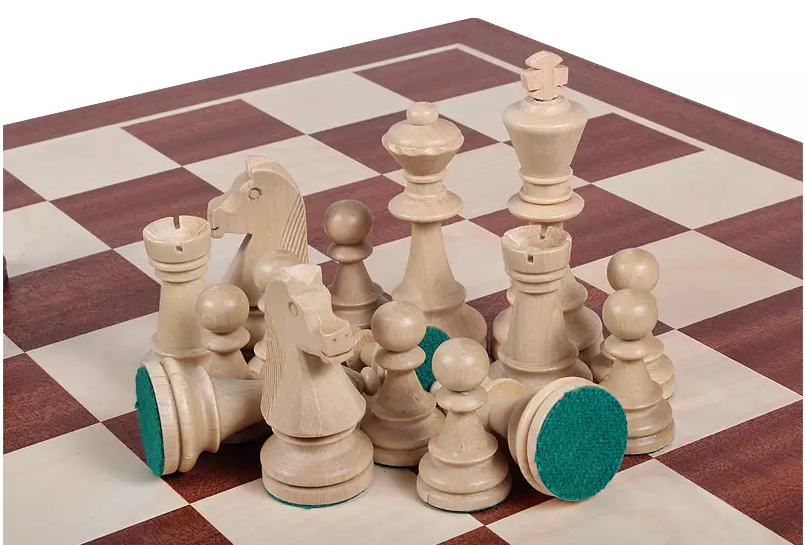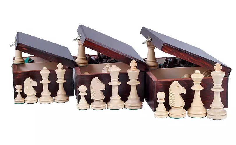 Figury: są starannie wykończone, obciążone i od spodu podklejone filcem, dzięki czemu wygodnie trzyma się je w dłoni i przesuwa po szachownicy.