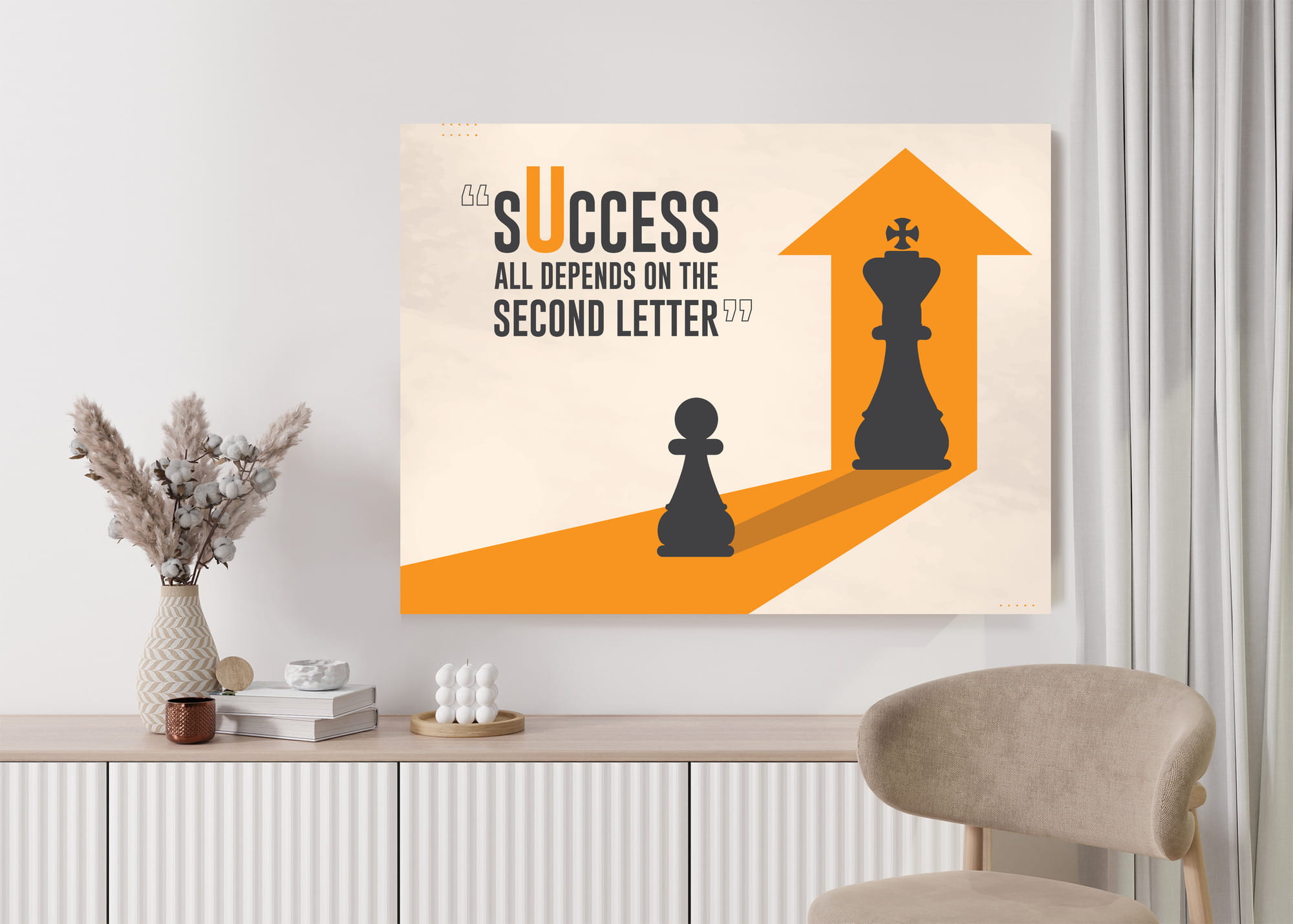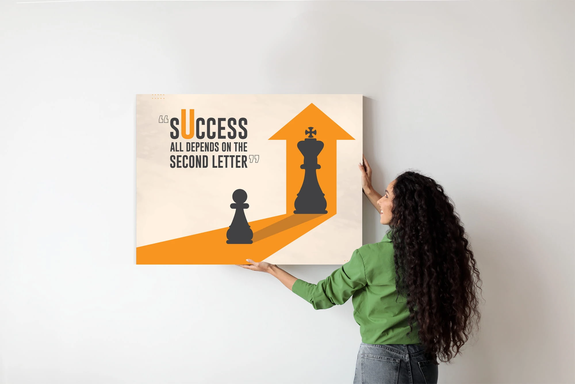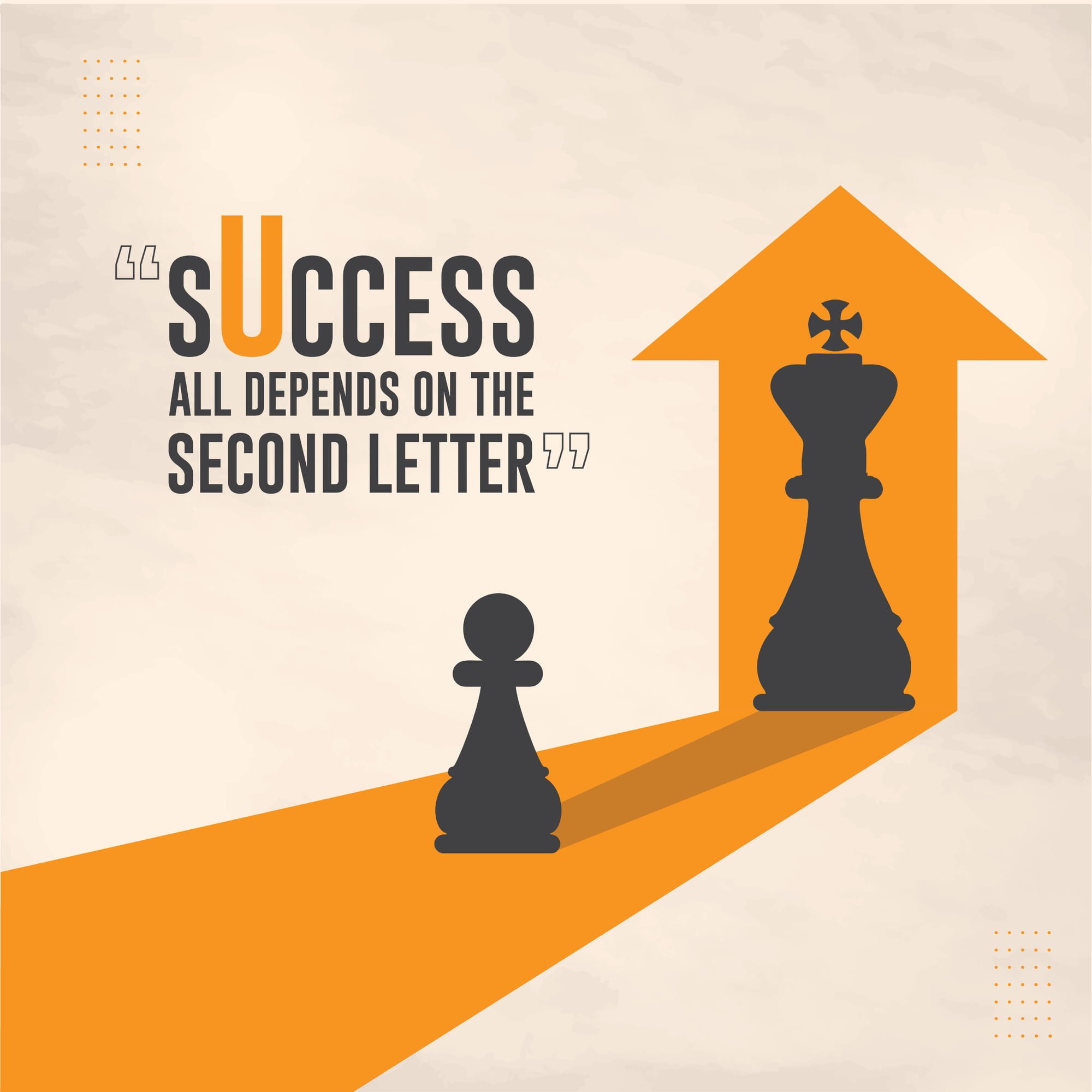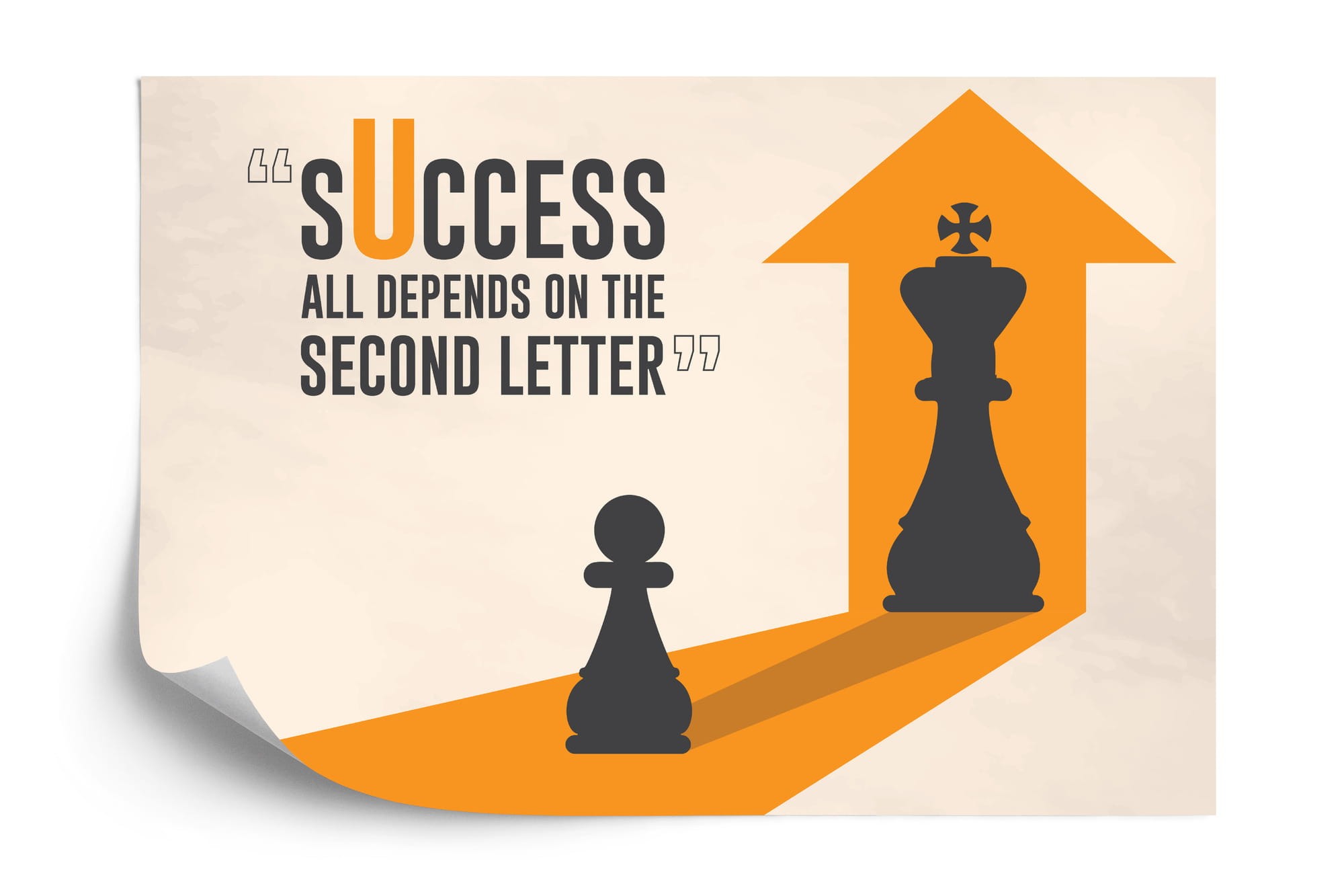 „Success – All Depends on the Second Letter” to głęboka gra słów i obrazów. Pionek patrzy w swoje odbicie, w którym pojawia się Król, co symbolizuje, że wszystko w życiu zależy od decyzji, które podejmujemy – dosłownie „od Ciebie” (w skrócie „U”, jako druga litera słowa „you”). To przypomnienie, że każdy krok, każda decyzja – nawet mały ruch na początku – może prowadzić do wielkiego sukcesu