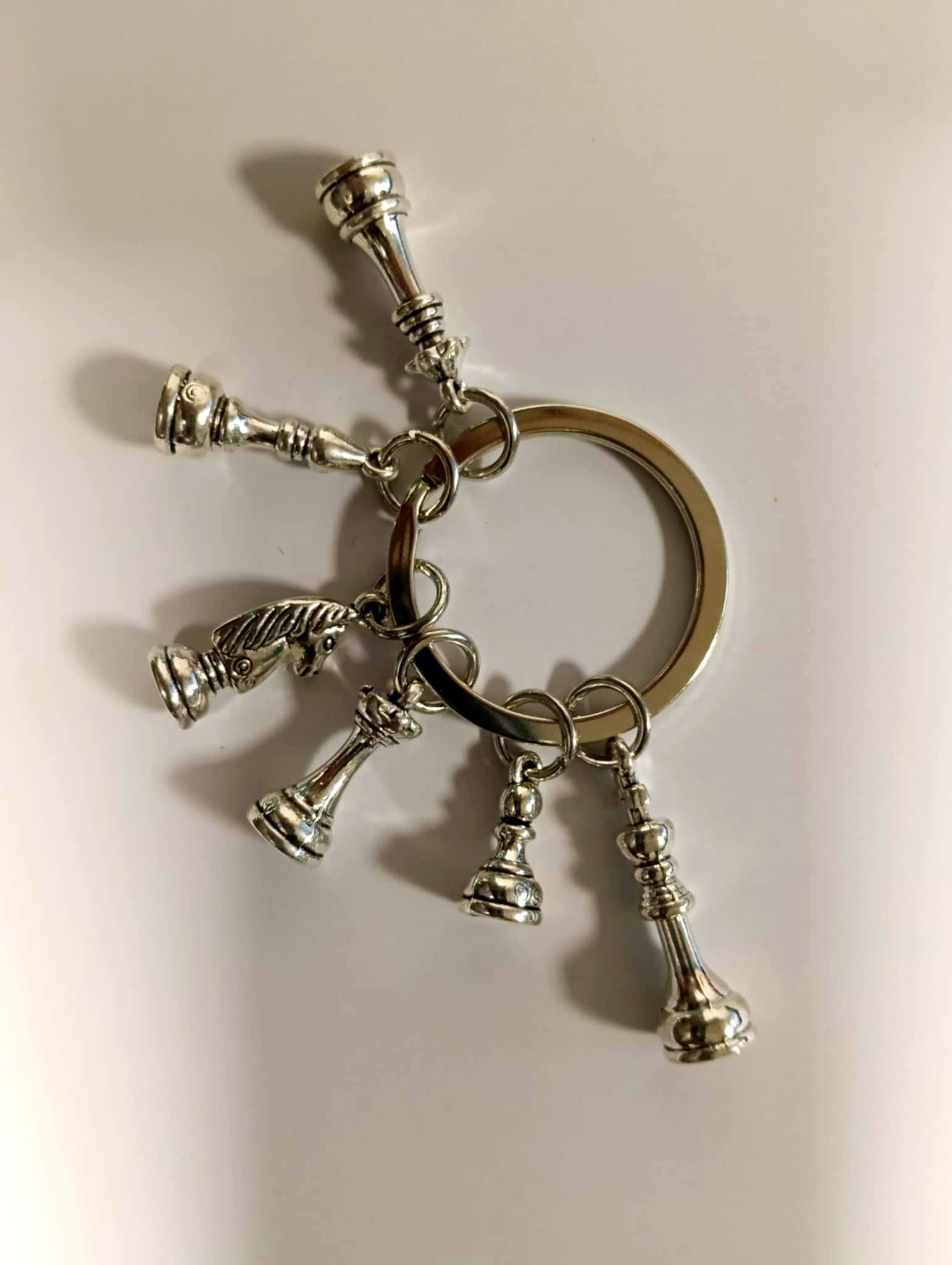 Stylowy brelok wykonany z metalu w kolorze srebrnym, ozdobiony sześcioma zawieszkami przedstawiającymi wszystkie klasyczne figury szachowe: pionka, wieżę, skoczka, gońca, hetmana oraz króla. Każdy element został wykonany z dbałością o szczegóły, co nadaje brelokowi elegancki i niepowtarzalny charakter.