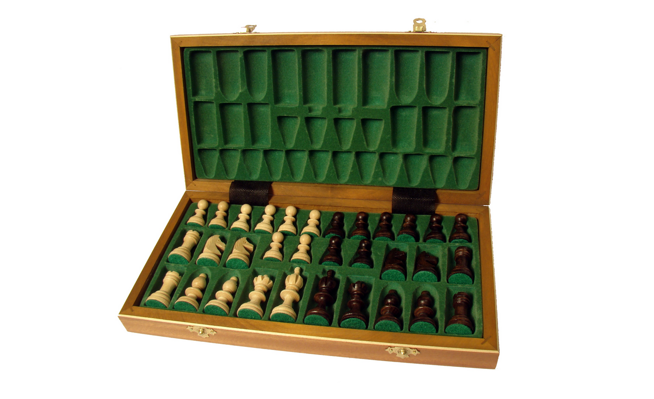 Komplet średniej wielkości, kaseta intarsjowana, klasyczne drewniane tradycyjne i piękne szachy Polskiej produkcji