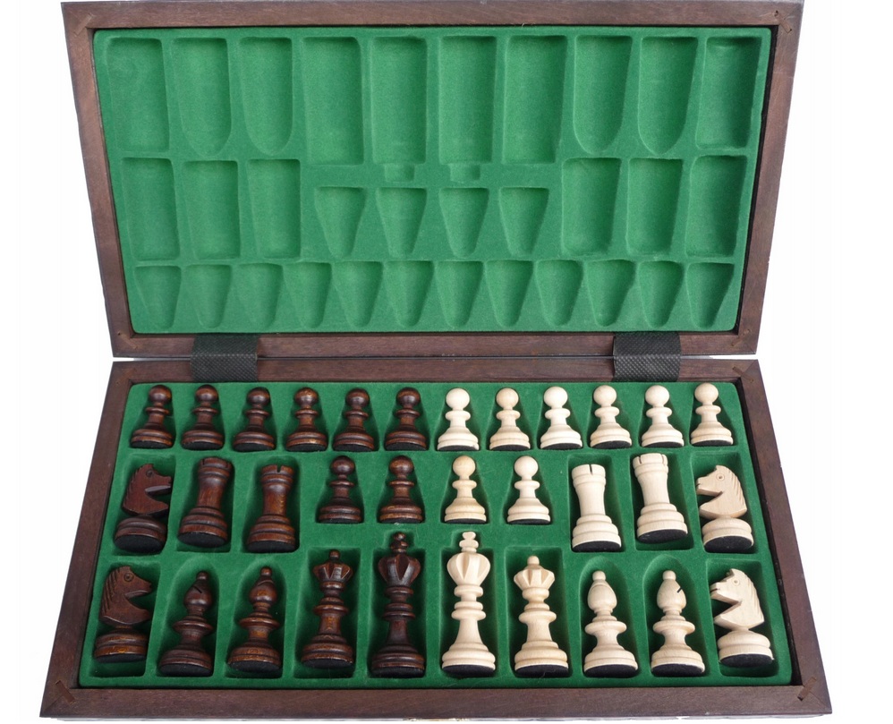 W zestawie znajduje się drewniana, ręcznie malowana i wypalana kasetka, a także klasyczne figury szachowe w stylu Staunton.