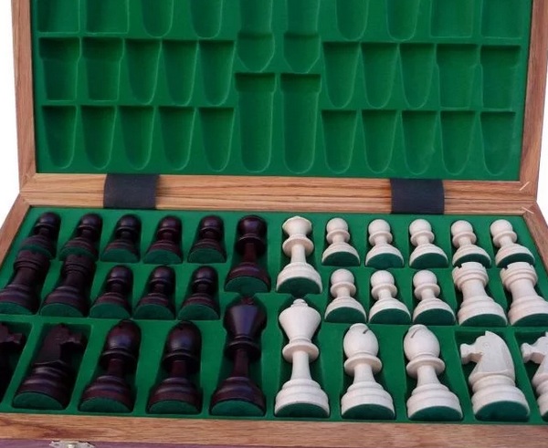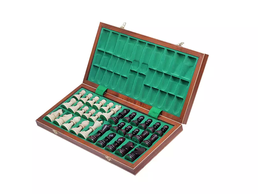 Wewnątrz posiada ona wkładkę z oddzielnymi wgłębieniami na poszczególne figury szachowe.