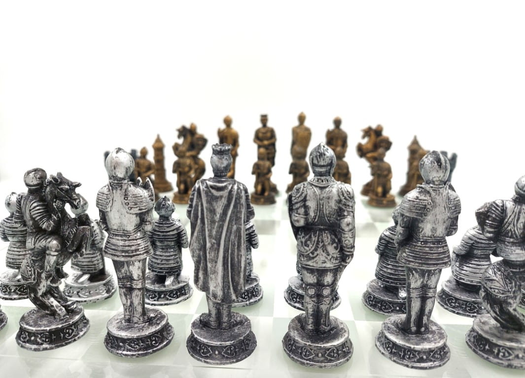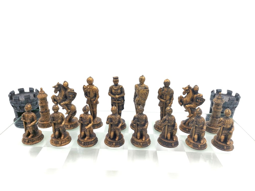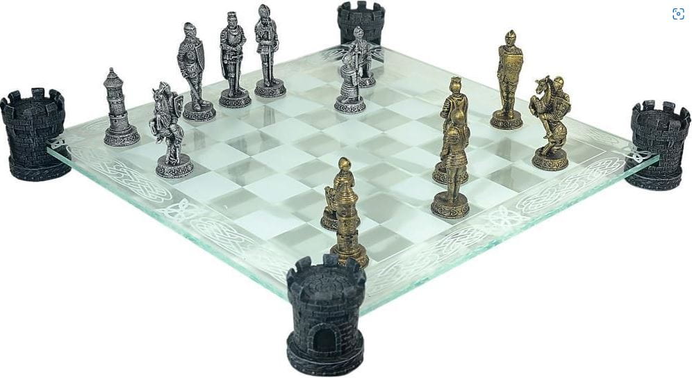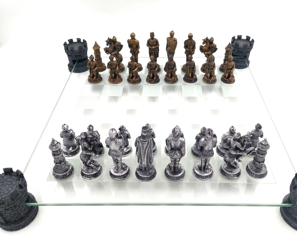 Piękny zestaw szachów rycerskich wykonany z poliresinu i szkła.